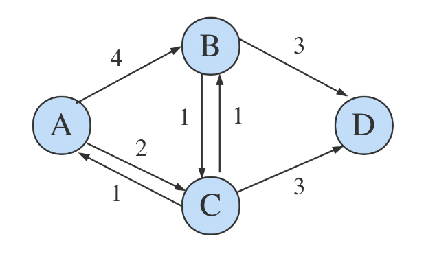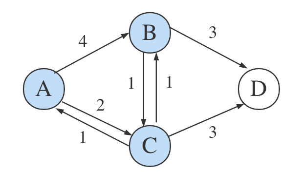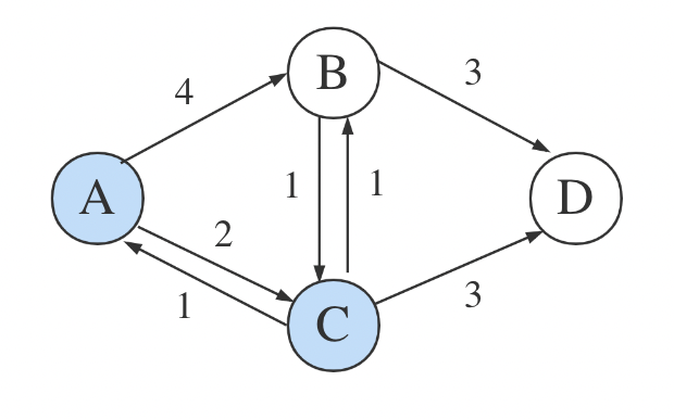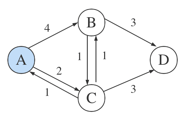 Dijkstra 算法能够解决 single-source 的最短路径问题,算法本身只输出一个点到其他点的最短距离。比如在这样一个图中,起点是 A,想知道到 D 点的最短距离是多少: