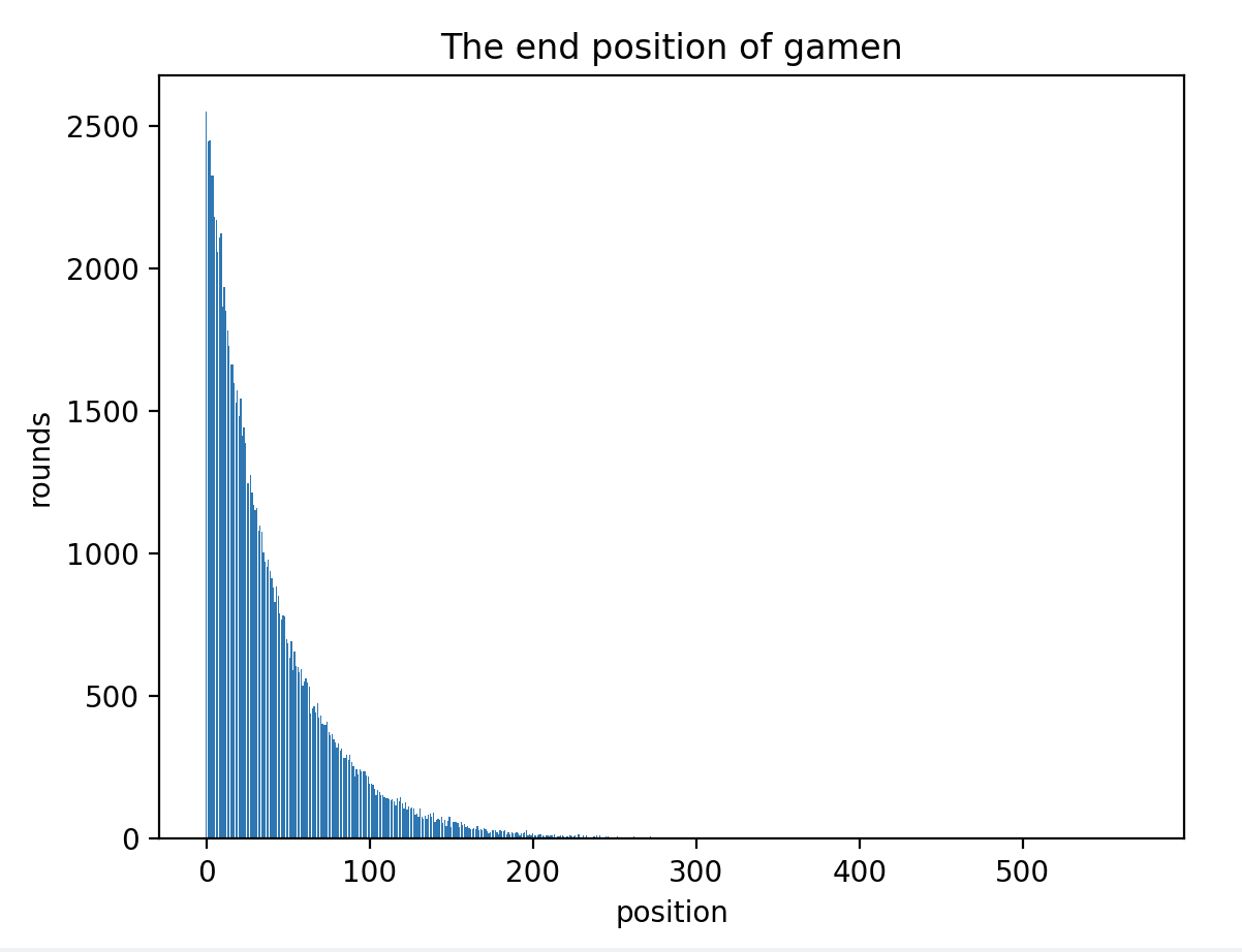 这个图的横坐标是参与游戏的玩家数量,纵坐标是在对应的数量上,游戏结束的次数。比如在接近 1 的位置上,有 2500 次,说明在 10 万次游戏中,有 2500 次 1 个玩家参与就结束了。