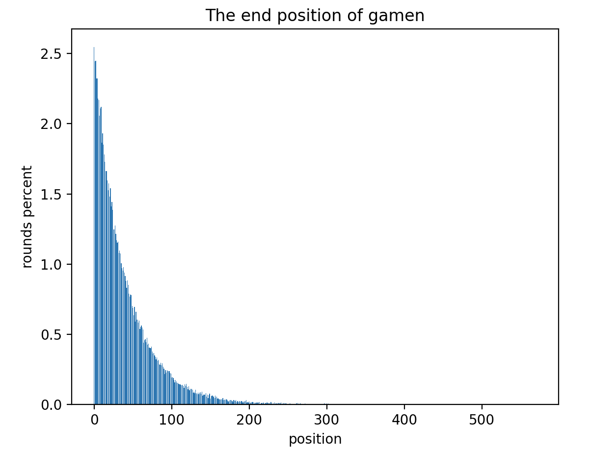 如果次数不够直观的话,可以看这个比例的图,每个数字上结束的比例不超过 2.5%。越靠前的位置,游戏结束的可能性越大,因为每次都是从 0 开始,前面的位置结束游戏的机会更多一点。