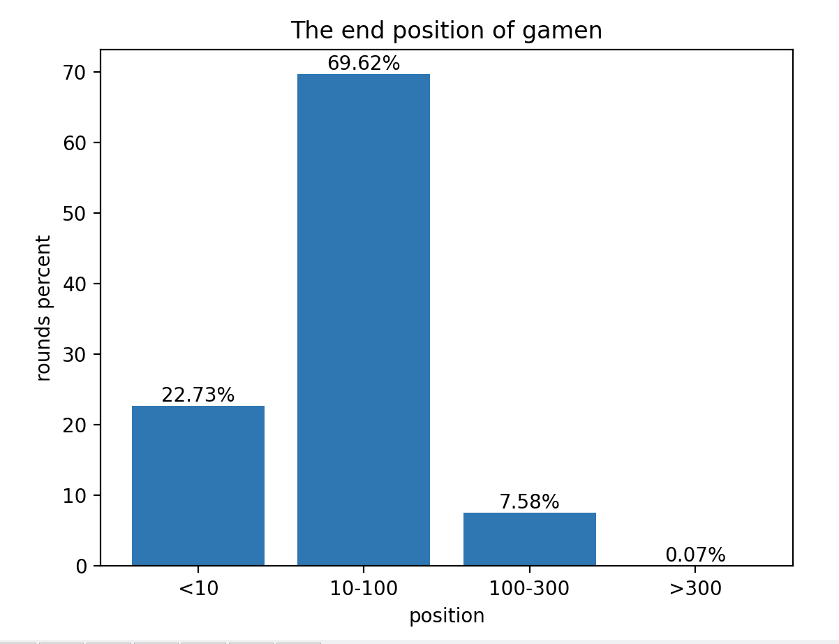 这个比例统计图更能够说明结果,游戏有接近 20% 的概率在参与人数小于 10 的情况下结束,有接近 70% 的概率在参与人数为 [10, 100] 的范围内结束。参与人数大于 300 才结束游戏的概率,只有 0.07%。