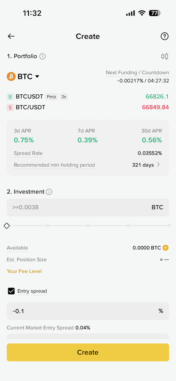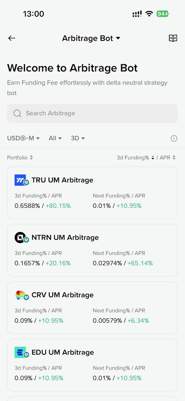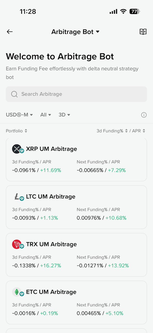这里的 Arbitrage Bot 就是资金费率套利的 Bot,点开可以看到有很多币种可以选,包括按照资金费率来排序等。而且 Binance 的 Bot 做的很智能,如果资金费率是正的,就开正向的套利策略(使用 USDT),如果资金费率是负的,就开反向的策略(使用代币)。