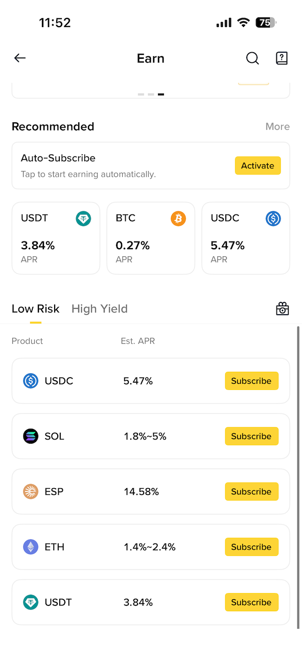 Simple Earn 很简单,存到 Binance 里赚利息。问题在于 APR 并不高,USDC 也就 6%,而且有非常高的额度限制,只支持 200 USDC。几乎没什么用。
